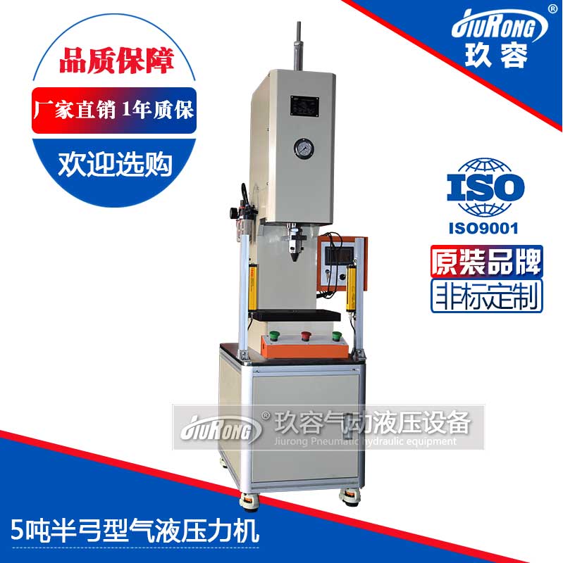 5吨C型好色先生TV下载安卓机产品型号为JRS-80-100-10L-5T-10B-220V,带机罩带底座,采用半弓型结构上下料方便,操作舒适,5吨力行程可调好色先生TV下载安卓缸作为气动执行元件,有单导柱结构冲压可导向防转,PLC自动化编程控制器控制,配合三按钮操作盒操作简便,产品还加装了安全光栅,提高了作业的安全系数。